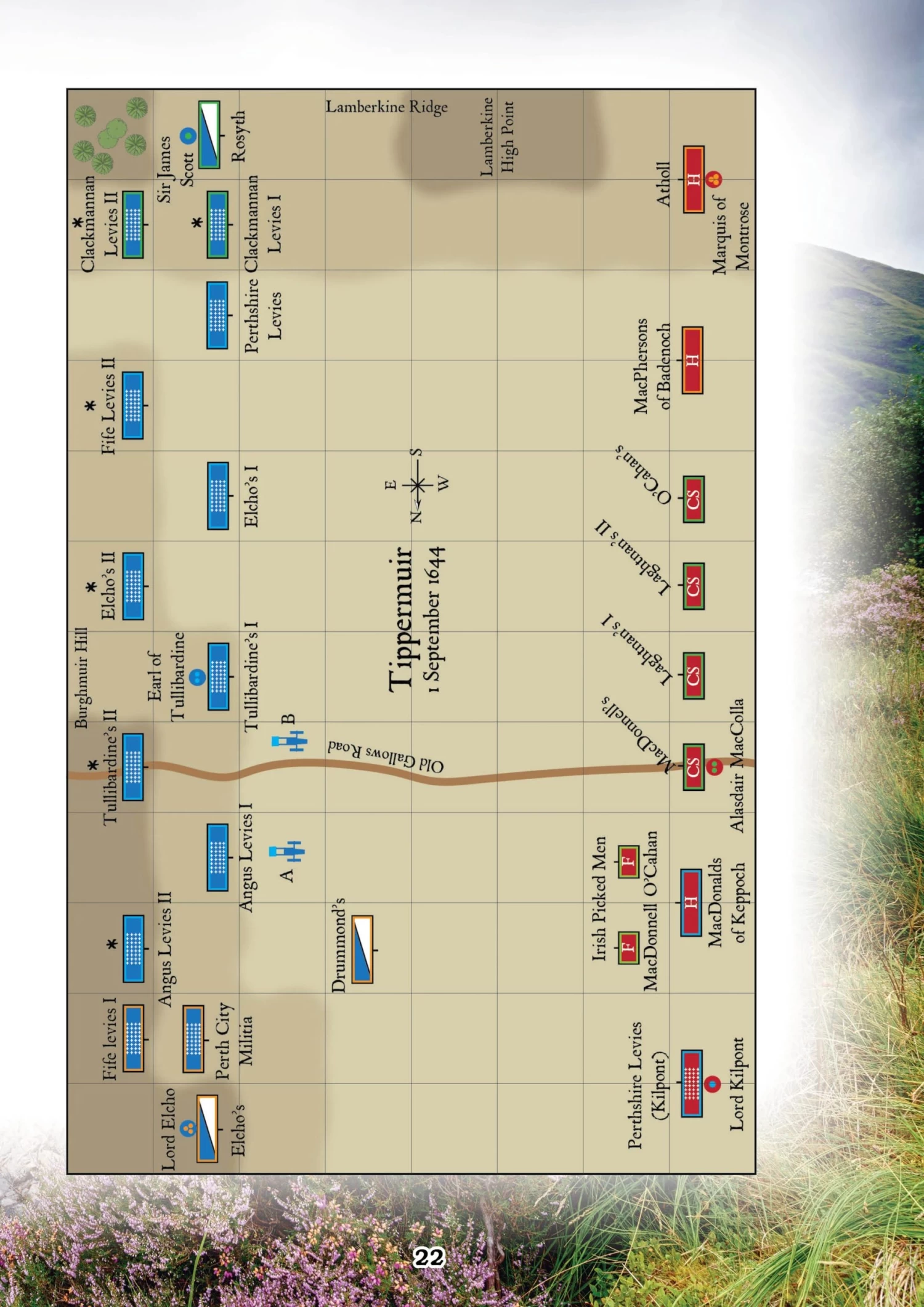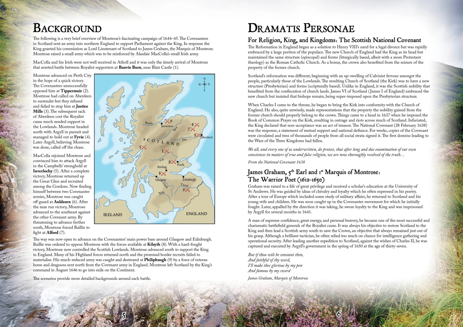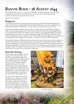 It contains nine free-standing scenarios covering the Marquis of Montrose’s battles in Scotland in 1644-45. Eight are historical and one, a “what if”. Each scenario contains a background briefing, separate briefings for each of the players, a deployment plan and an order of battle. The scenarios can be played individually or in sequence, as a campaign. The book also includes a background to the campaign and descriptions of the principle personalities involved, including Montrose, Alastair MacColla and Archibald Campbell.