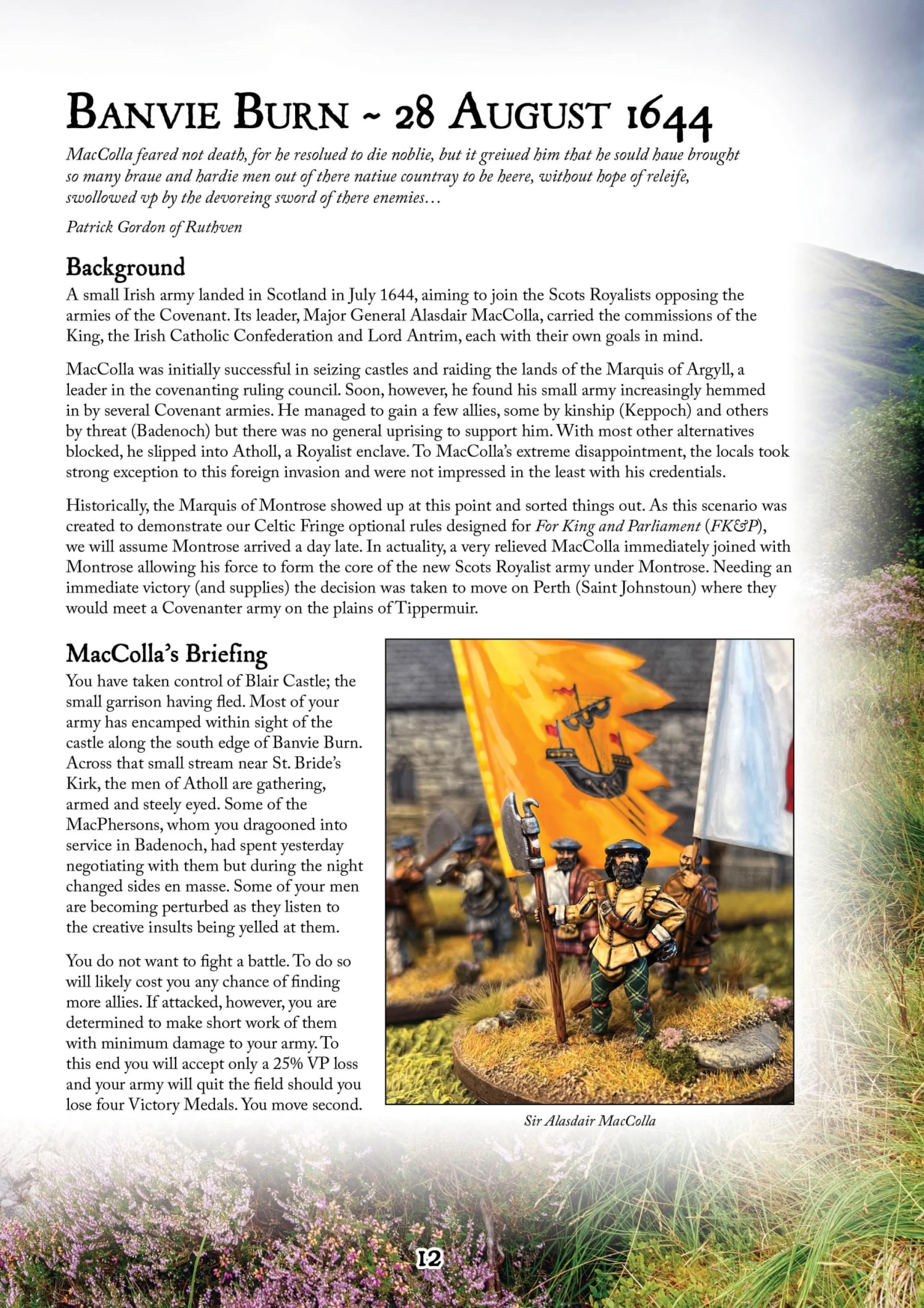 This 90-page scenario book is designed for use with the TtS! For King and Parliament English Civil War rules and the Celtic Fringe extra rules, but could be adapted for use with other rule systems.