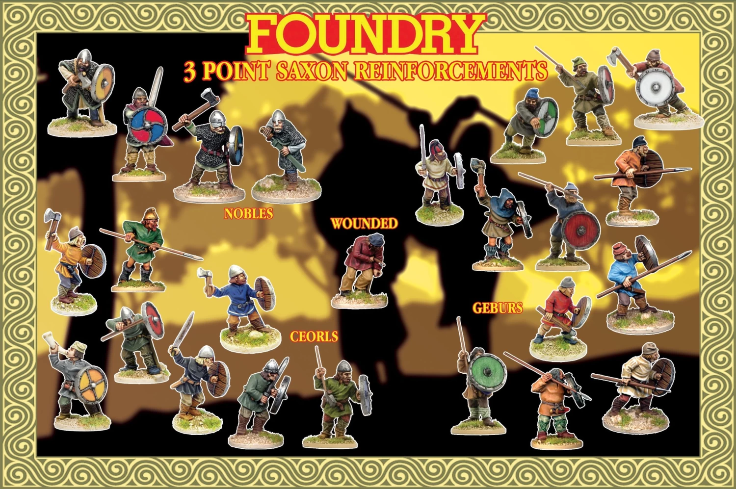 This box contains 25 models, all the figures needed for Saxon reinforcements. Includes 4 Nobles, 8 Ceorls, 12 Geburs and 1 Wounded. 10 x 40mm spears, 22 assorted shields and 25 x 25mm round plastic bases included. Supplied unpainted. 28mm scale metal miniatures.